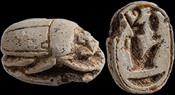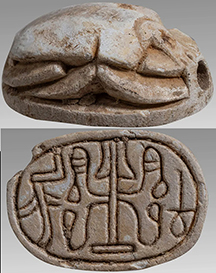 Third Intermediate Period, c. 1570-747 BC. Steatite scarab. The base with symbols that in themselves don't say anything but overall represent luck and protection. L: 16mm. Ex Malter galleries, Encino, CA. #AE3261: $450 SOLD