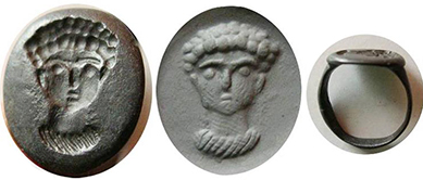 Ancient Roman, c. 3rd century AD, museum quality signet ring with a bust of a man facing right, holding a short staff, which could indicate he is an emperor, likely one of the Severan emperors. US size 10.5. Excellent glossy deep olive-green, almost black patina. Ex Northern California private collection. Every ancient “signet” or “seal” ring was unique and could pass as a "signet" (where we get our word "signature" into clay or wax seals on documents. #JR2424: $450 SOLD