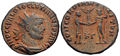 Ancient Rome. Diocletian, 284-305 AD. Nice bronze antoninianus, Cyzicus mint, struck 295-299 AD. His radiate, draped, cuirassed bust right, IMP CC VAL DIOCLETIANVS PF AVG / Emperor standing right receiving Victory on globe from Jupiter, standing left and holding scepter, CONCORDIA MI-LITVM. Mintmark K;Gamma; in lower centre. ref: RIC VI 16a for type. 19 mm, 3.43 g. Ex New Jersey collection. #CR3586: $99 |