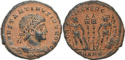 Constantius II, 337-361 AD. Bronze nummus, Antioch mint. Laureate, cuirassed bust right, FL VAL CONSTANTIVS IVN NOB C / Two soldiers holding spears and shields with one standard between them, GLORIA EXERCITVS; SMANS. ref: RIC VII for type.1718 mm, 2.41 g. Nice detail, light earthen deposits. #CR3376: $75 |