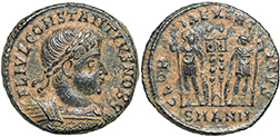 Constantine II, 337-340 AD. Bronze follis, Antioch mint, struck 330-335 AD. Laureate, cuirassed bust right, CONSTANTINVS IVN NOB C / Two soldiers holding spears and shields with two standards between them, GLOR-IA EXERC-ITVS. Mintmark: SMANH. 17 mm, 2.61 g. ref: RIC VII Antioch 87. Nice green patina. #CR2208: $99 |