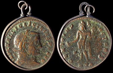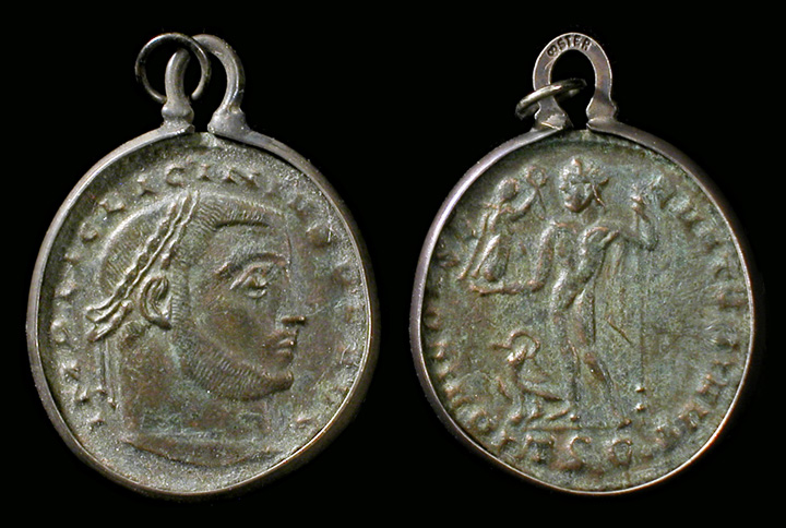 Ancient Rome. Licinius I, 308-324 AD. Bronze follis, set in custom silver bezel toned to match. His laureate bust right, IMP LIC LICINIVS P F AVG / Jupiter standing left, chlamys across left shoulder, holding Victory and sceptre, eagle with wreath left, IOVI CONSERVATORI; SIS (Siscia mint). 21 mm dia. Nice green patina. #JN2049x2: $150 SOLD