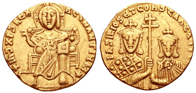 Byzantine Empire. Constantine VII with Romanus II, gold solidus struck c. 920 - 944 AD.Facing bust of Christ, nimbate, raising right hand in benediction and holding book of gospels; IhS SPE REX REGNANTIUM / Facing, crowned busts of Constantine VII with short beard on left, wearing loros, and Romanus II, wearing chlamys, unbearded, on right, holding long patriarchal cross between them; CONSTANT' CE ROMAN M AVGG bR. ref: DOC 15; Sear 1751. 19.7 mm, 4.38 g. Great coin, well-centered and well-struck. Great gold tone. #18474x2: $1199 SOLD