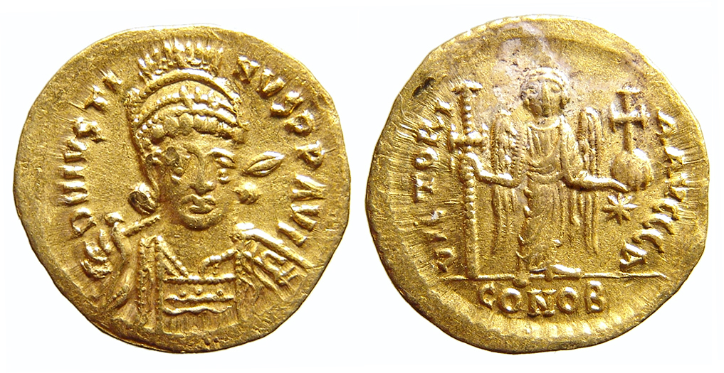 Byzantine Empire. Justin I, 518-527 AD. Gold Solidus, struck 519-527 AD. Constantinople mint. His helmeted and cuirassed bust facing three-quarters to right, holding spear over shoulder and shield decorated with horseman spearing a fallen enemy, D N IVSTI-NVS P P AVG / Angel standing facing, holding jewelled cross and cross on globe, VICTORIA AVGGG, officina I; star in right field; mintmark CONOB. 21 mm, 4.44 g. ref: DOC I 2b; MIB I 3; BN 6; SB 56. Small indentation at the tip of angel's wing. Excellent detail, lustrous surfaces. #CB2076: $950 SOLD