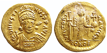 Byzantine Empire. Justinian I, 527-565 AD. Gold solidus, struck 545-565 AD at Constantinople. His helmeted and cuirassed bust facing, holding globus cruciger, DN IVSTINIANVS PP AVG / Angel standing facing, holding long Chi-Rho-headed cross & globus cruciger, VICTORIA AVGGG(theta), CONOB in exergue. 21 mm, 4.51 g. ref: DOC 9F; SB 140. Near-EF! Excellent detail, lustrous surfaces. A gem! Ex-Frank S. Robinson, NY. #CB2056: $850 SOLD