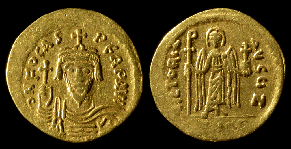 Byzantine Empire. Phocas, 602-610. Gold solidus, Constantinople mint, 7th officina. Struck 607-610 AD. His crowned, draped, and cuirassed facing bust, holding globus cruciger, DN FOCAS PERP AVG / Angel standing facing, holding long staff with backwards Chi-Rho tip and globus cruciger, VICTORIA AVGU; Z//CONOB. 21.5 mm, 4.32 g. ref: DOC 10g; SB 620. Great detail! #CB2114: $850 SOLD