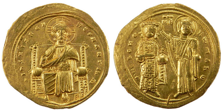 Byzantine Empire. Romanus III, Argyrus. 1028-1034 AD. Large Gold Histamenon, Constantinople mint. +IhS XIS REX REGNANTINM, Christ enthroned facing, wearing nimbus, pallium and colobrium, raising right hand in benediction, holding Book of Gospels in left / THCE BOHTH RWMANW, Virgin Mary (nimbate) crowning emperor Romanus. Coin is in near perfect condition. ref: Sear 1819, DOC 1c. 25 mm, 4.42 g. Property of Princeton Economics acquired by Martin Armstrong. Ex Ed Borasio Collection (Sotheby's New York, 12 December 1994), lot 29. #901946-sn1cc: SOLD