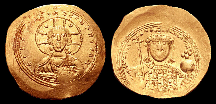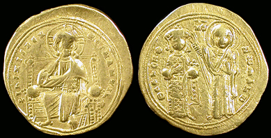 Byzantine Empire. Constantine VIII. 1025-1028. Large gold histamenon nomisma. Bust of Christ facing wearing nimbus cross with two crescents in its upper quarters, holding book of gospels and raising right hand, triple border. +IhS XIS REX REGNANTINM / Crowned bust of Constantine VIII facing, with long beard, wearing loros, holding labarum and akakia, triple border. +CWNSTANTIN bASILEVS ROM. 25 mm, 4.41 g. Nice, lustrous XF. Ex-Daniel F Sedwick collection. A breathtaking example! #49360: $1299 SOLD