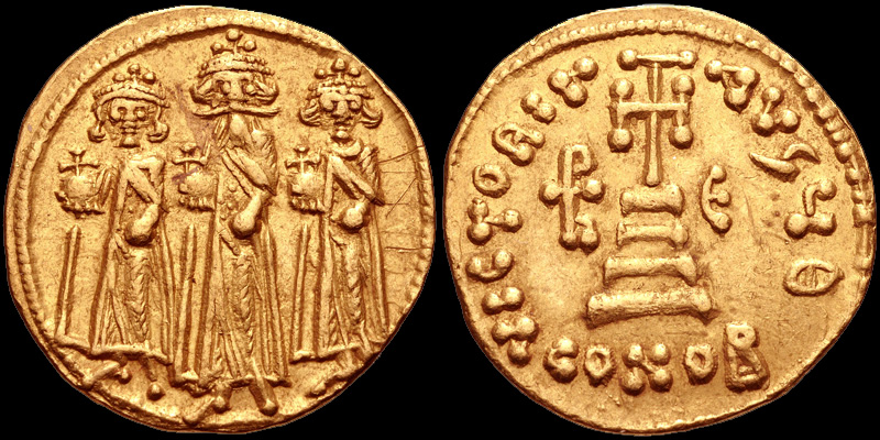 Heraclius, with Heraclius Constantine and Heraclonas. 610-641. Gold Solidus, Constantinople mint, 1st officina. Struck 637-638 AD. Heraclius, crowned, with long moustache and long beard in centre, Heraclonas, crowned, on left, and Heraclius Constantine, crowned, unbearded, on right, all wearing chlamys and holding cross on globe / True Cross on three steps, VICTORIA AVGU (Theta), monogram and officina letter "A", CONOB below. 18.5 mm, 4.27 g. ref: DOC 39d; MIB 45; SB 764. Ex-Sphinx Numismatics. Very Fine, light scratches on reverse. #43720-cyk SOLD