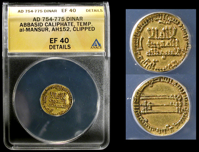 Ancient Islamic/Arabic. Abbasid caliphate. al-Mansur, 754-775 AD. Beautiful gold dinar, NM mint, struck AH 152. ref: Album-212. ANACS graded EF-40 details. Slabbed & authenticated by ANACS. ex-Stephen Album collection. #CP2043: $750 SOLD