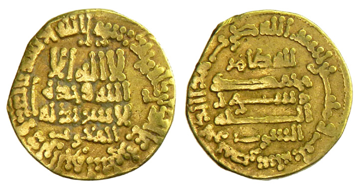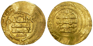 Ancient Islamic. Abbasid Caliphate. al-Muqtadir, 908-932 AD. Gold dinar, al-Karaj mint, struck 318 AH. Mint recut from what was probably al-Kufa. ref: Album-245.2. 23 mm, 2.66 g. VF, Rare! During this period, dies were produced at a central location near Madinat al-Salam, and distributed to other mints. ex-Stephen Album. #CP2045: $650 SOLD
