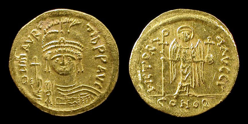 Byzantine Empire. Maurice Tiberius. Gold solidus, struck 583 AD at Constantinople mint. Helmeted & cuirassed facing bust, holding globus cruciger, DM MAVRC TIB PP AVC / Angel standing facing, holding long Chi-Rho-headed cross & globus cruciger, VICTORIA AVGGG (gamma), CONOB in exergue. 22 mm, 4.53 grams. #4305: $799 SOLD