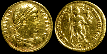 Ancient Rome. Valens,364-378 AD. Stunning gold solidus, Antioch mint, struck 364-367 AD. His pearl-diademed, draped and cuirassed bust right, DN VALENS PER F AVG / Emperor in military attire, standing facing, head right, holding labarum (chi-rho in standard) and Victory on globe holding wreath above his head, RESTITVTOR REIPVBLICAE. Mintmark: ANTS dot. 20.5 mm, 4.10 g. Faint wave to flan. ref: RIC IX 2d, xiii.5; cf. Cohen 32. ex-Canadian private collection. A gorgeous coin, much nicer in-hand! #CR2530: $1600 SOLD