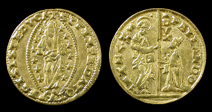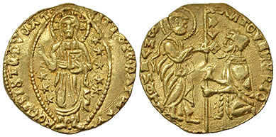 Crusaders, Venetians in the Levant. Under doge Andrea Dandolo, c. 1344-1382 AD. Gold Ducat, imitating Venice. Christ standing facing, raising hand in benediction and holding Gospels, surrounded by elliptical halo containing four stars to left, five to right; pellet between feet, TACVCE TSISI : GP • VT • Q‘TAC • EP XTTIS / Saint Mark standing right, holding Gospels and presenting banner containing two pellets to Doge kneeling left, DVX down flag staff, SZVENETI (horizontal)/ VECBCANCVTO. 21mm, 3.49 g. Ref: CNI VII 37 (for type); cf. Ives pl. XIII (same); cf. Gamberini 344 (Roberto d’Angio pr. Acaia). Near EF, slightly clipped. From the Prue Morgan Fitts Collection. Ex Classical Numismatic Review XXVII (Summer 2002), no. 89. #CM2199: $1200 SOLD