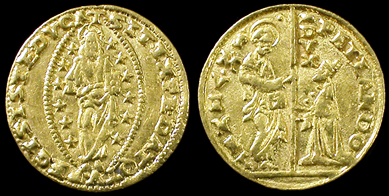 Medieval Venice, Italy. Andrea Dandolo, Doge of Venice 1343-1354 AD. Gold Ducat. St. Mark presenting banner to kneeling Doge, ANDR DANDVLO DVX S M VENETI / Christ standing facing, raising hand in benediction and holding Gospels, surrounded by elliptical halo containing twelve stars, SIT T XPE DAT Q TV REGIS ISTE DUCAT. 20 mm, 3.53 g. ref: Paol 29.1. Rare! An extremely nice example with sharp detail, nice surfaces. #CM2186: $850 SOLD