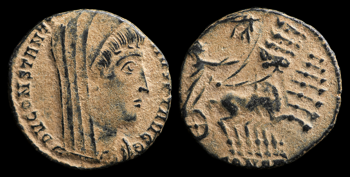 "Manus Dei", the "Hand of God." Divus Constantine I the Great, post-mortem issue struck after his death, 337-340 AD, Antioch mint. Veiled head of Constantine right, DV CONSTANTINVS PT AVGG / Constantine driving galloping quadriga right, the hand of God reaching down from above. Mintmark SMAN-T. 14.5 mm, 1.32 g. ref: RIC VIII 37. Black patina with reddish earthen deposits. Great detail under earthen deposits. ex-CNG. #CR2258: $150
