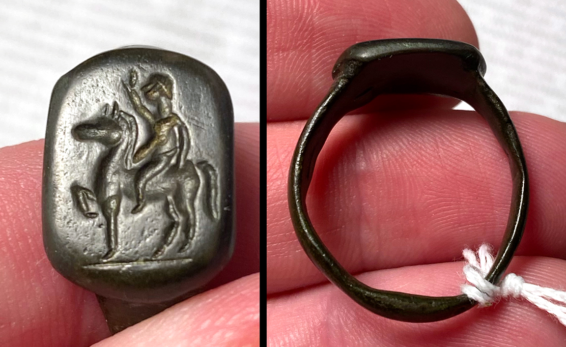 Ancient Rome, c. 2nd-3rd century AD. Museum-quality bronze signet ring depicting a figure on horseback left, his right hand raised, left arm beside him. The horse has one leg raised in triumph, possibly a ring issued to a returning Legionnaire after serving his tour of duty. About US size 9. #JR2526: $499 SOLD