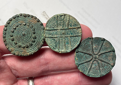 Celtic bronze ring-money, 5th-1st cent BC. Measures 19 mm outside diameter; about a US size 4. Olive-green patina, light earthen deposits. #AC2028: $99 SOLD -