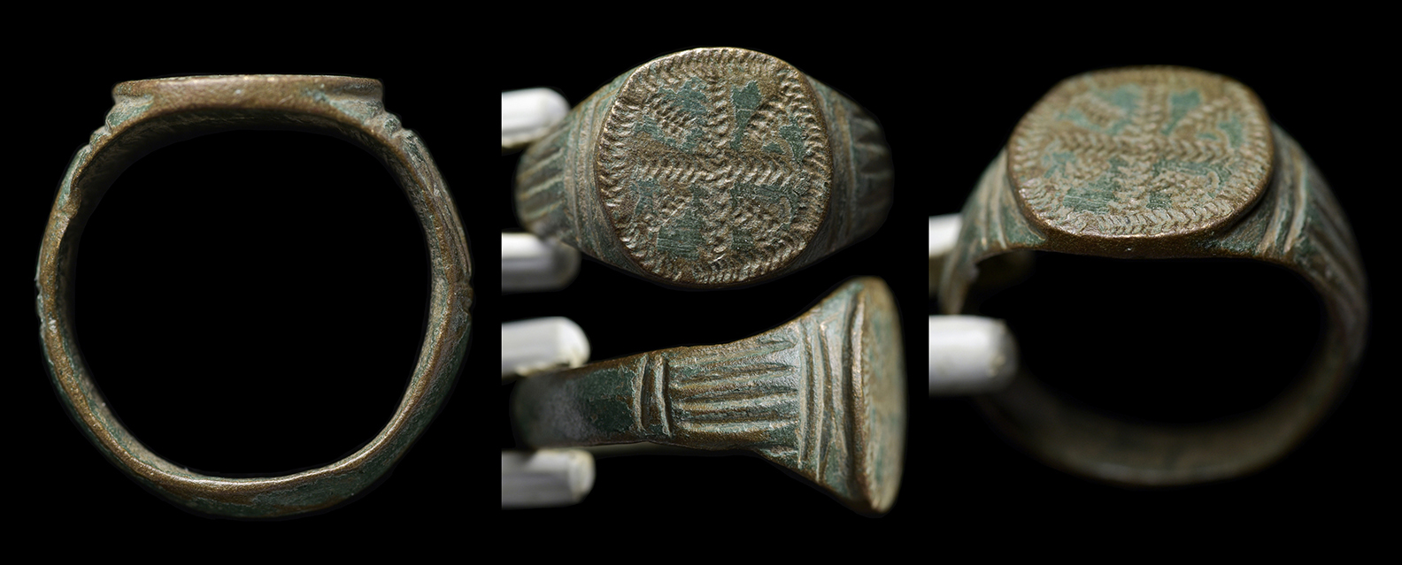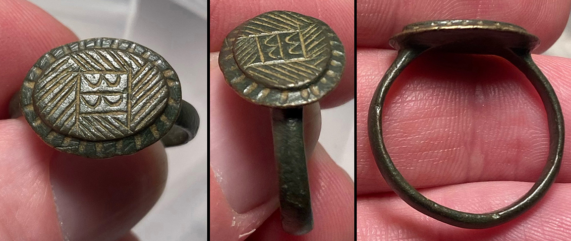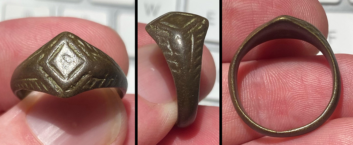 Byzantine Empire, c. 8th-12th century. Bronze ring with raised teardrop-shaped bezel engraved with deeply-cut linear design. Black patina. US size 6 1/4. Nicer than this washed-out photo! #JR2177: $125 SOLD