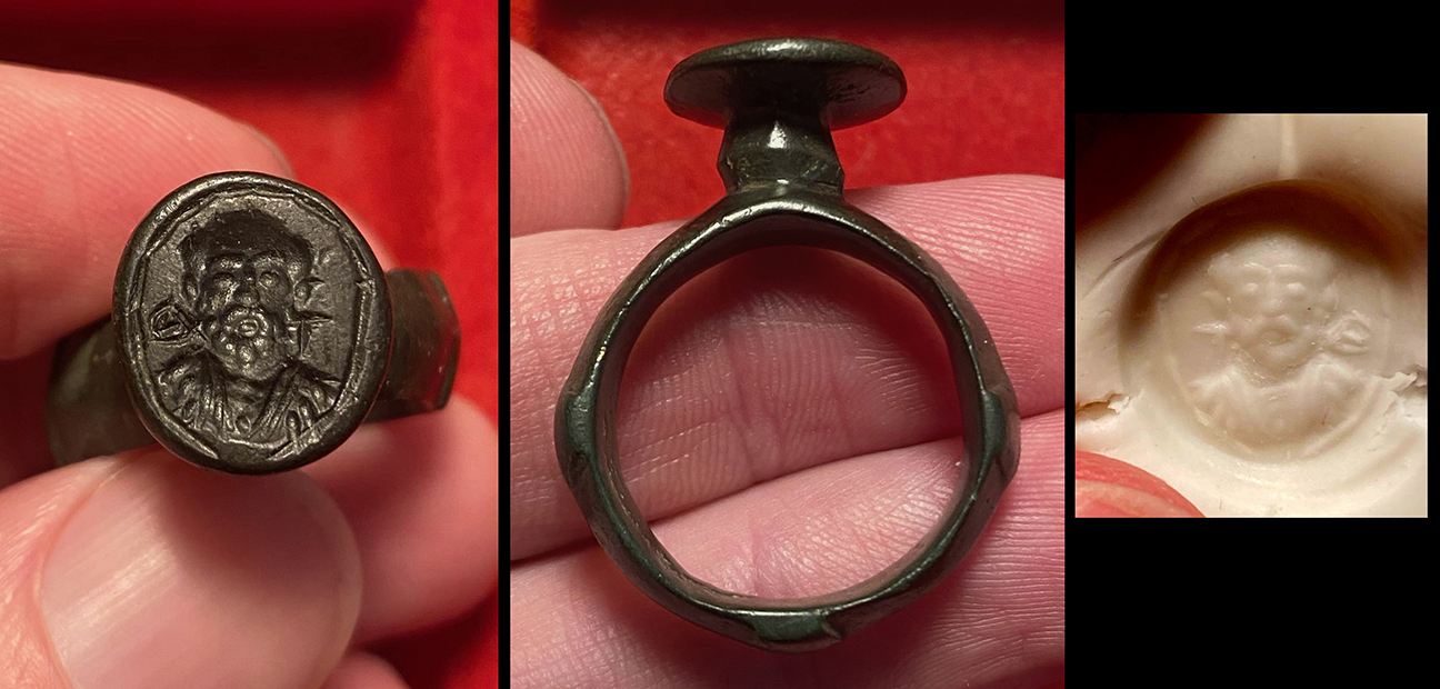 Byzantine Empire, c. 10th century AD. Incredibly rare bronze signet ring, the bezel engraved with the head of Jesus Christ with cross behind, IC-XC (Jesus Christos) to sides. About US size 9, excellent condition. This is an extremely special piece I should never sell. Ex Northern California collection. #JR2531: $750 SOLD