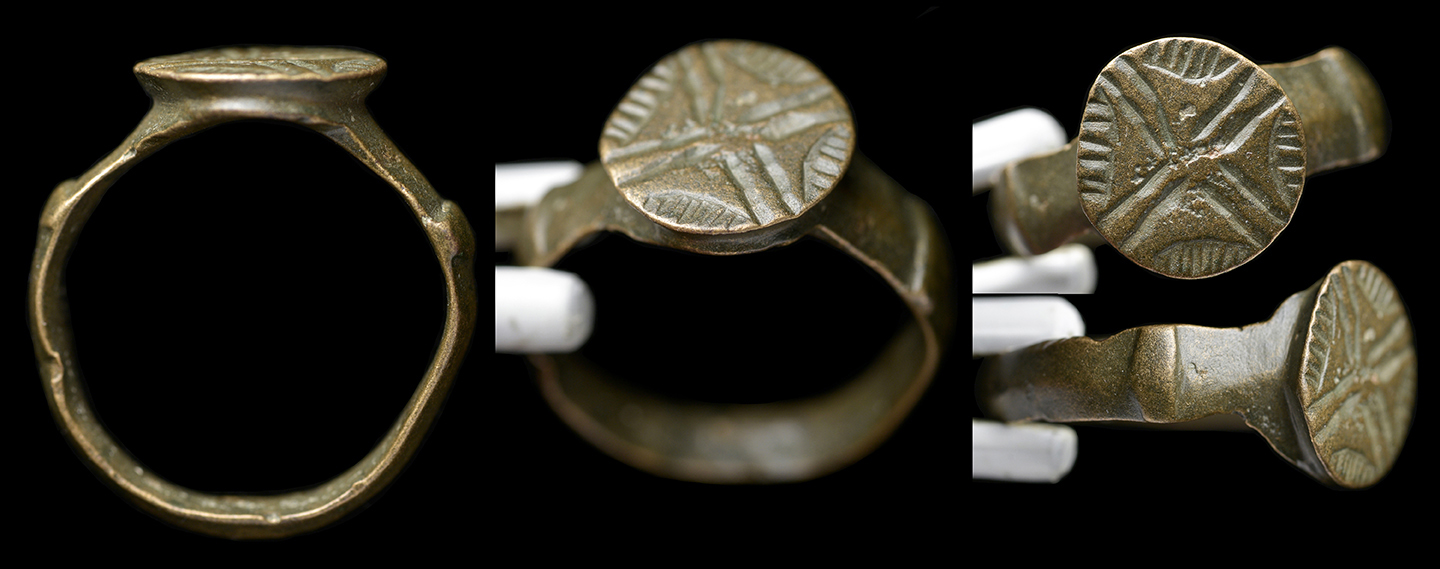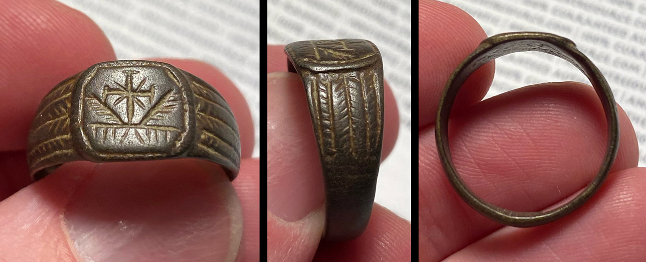 Medieval Europe, c. 9th-13th century AD. Bronze ring engraved with a Latin cross, incised "radiant" design around. Well-worn from use! US size 9 1/2. Brassy patina. #JR2241: $125 SOLD