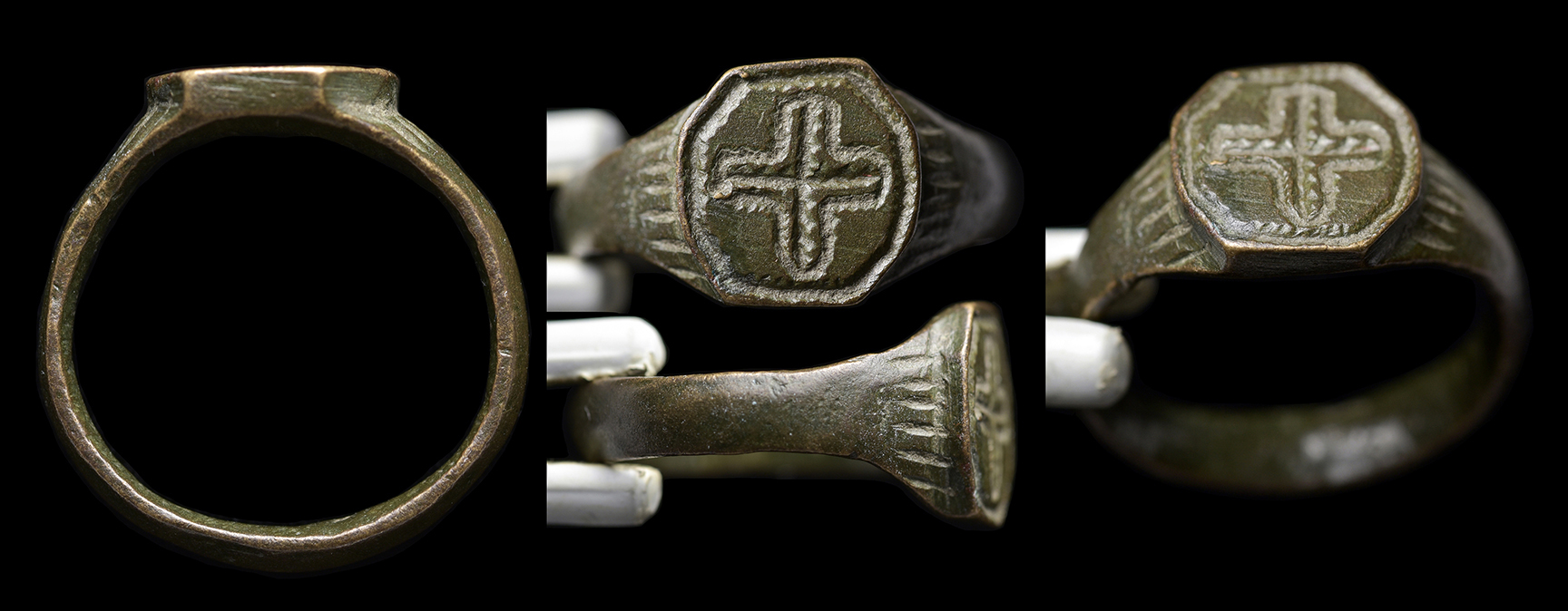 Medieval Europe, c. 8th-14th century AD. Nice bronze cross ring. Central outlined cross within octagonal bezel, engraved design at shoulders. About US size 7 1/2. ref: T.N. Polio, "Ancient Rings" p. 43 for type. Ex Los Angeles, CA collection. #JR2358: $199 SOLD