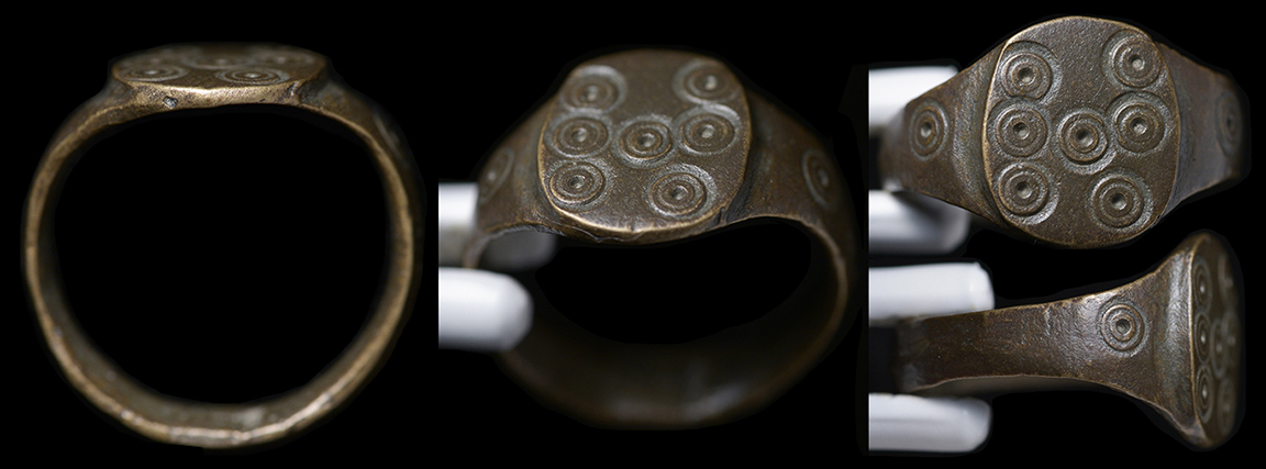 Late Medieval Europe, c. 14th-16th century AD. Small bronze ring, the bezel decorated with a dotted cross design, dots all around. About US size 5.5. ex Los Angeles, CA collection. #JR2355: $99 SOLD