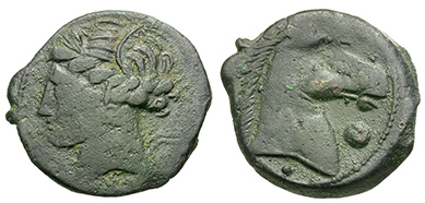 Carthage, Zeugitana, c. 300-264 BC. Bronze Shekel, Carthage mint. Wreathed head of Tanit left / Head of horse right. 19mm, 4.42 g. ref: MAA 57f; CNP 252t; SNG Copenhagen 154. Chocolate-brown patina with green highlights. VF. Great portrait! ex-London, UK collection. A gorgeous coin! #CG2570: SOLD