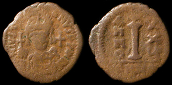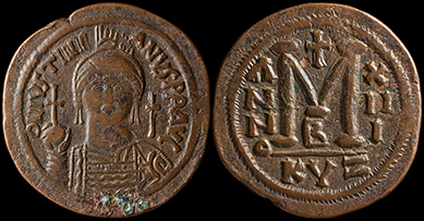 Byzantine Empire. Maurice Tiberius, 582-602 AD, Bronze Half Follis, Antioch as Theopolis mint. His crowned and mantled bust facing, holding mappa and eagle-tipped sceptre, DN MAV G I CN P AVG / Large K, ANNO to left, cross above, regnal year XU (year 15) to right, R below. ref: SB 535, MIB 99C. 21 mm, 5.19 g. #CB2132: $75 SOLD