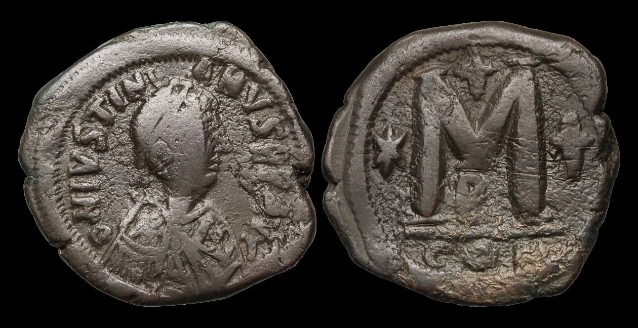 Byzantine Empire. Justin I, 518-527 AD. Bronze follis, Constantinople mint. Great big coin with brilliant emerald-green patina! D N IVSTINVS P P AVG, his diademed, draped, and cuirassed bust rt. / Large M with cross above, stars to sides. CON below. 33 mm diameter! #3601: $75 SOLD