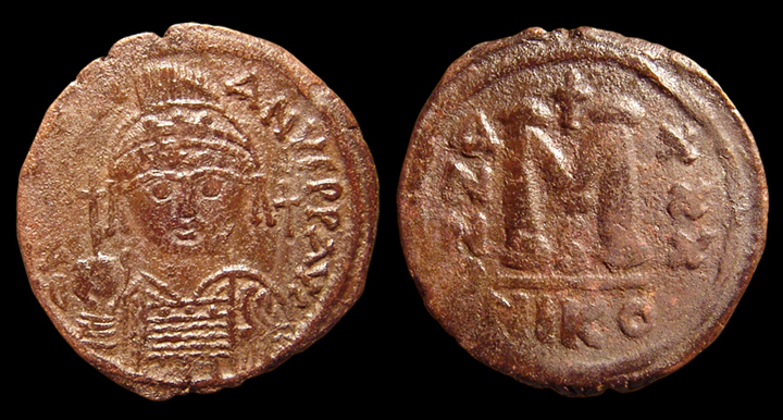 Byzantine Empire. Anastasius I, April 11, 491 to July 1, 518 AD. Bronze follis, Constantinople mint. Draped bust of emperor rt., D N ANASTASIVS PP AVG / Large M, cross above, CON below. 23 mm, 3.76 g. Nice black patina with earthen highlights. #CB2034: $75 SOLD