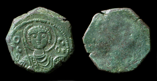 Justin IIand Sophia, 565-578 AD. Bronze half-follis, Thessalonica mint. D N IVSTINVS P P AVG, Justin at left, Sophia at right, seated facing on double-throne, both nimbate, Justin holding globus cruciger, Sophia holding scepter / large K, Q+C above, A/N/N/O to left, regnal year X to rt, TES below. 22 mm. #400: $45 SOLD