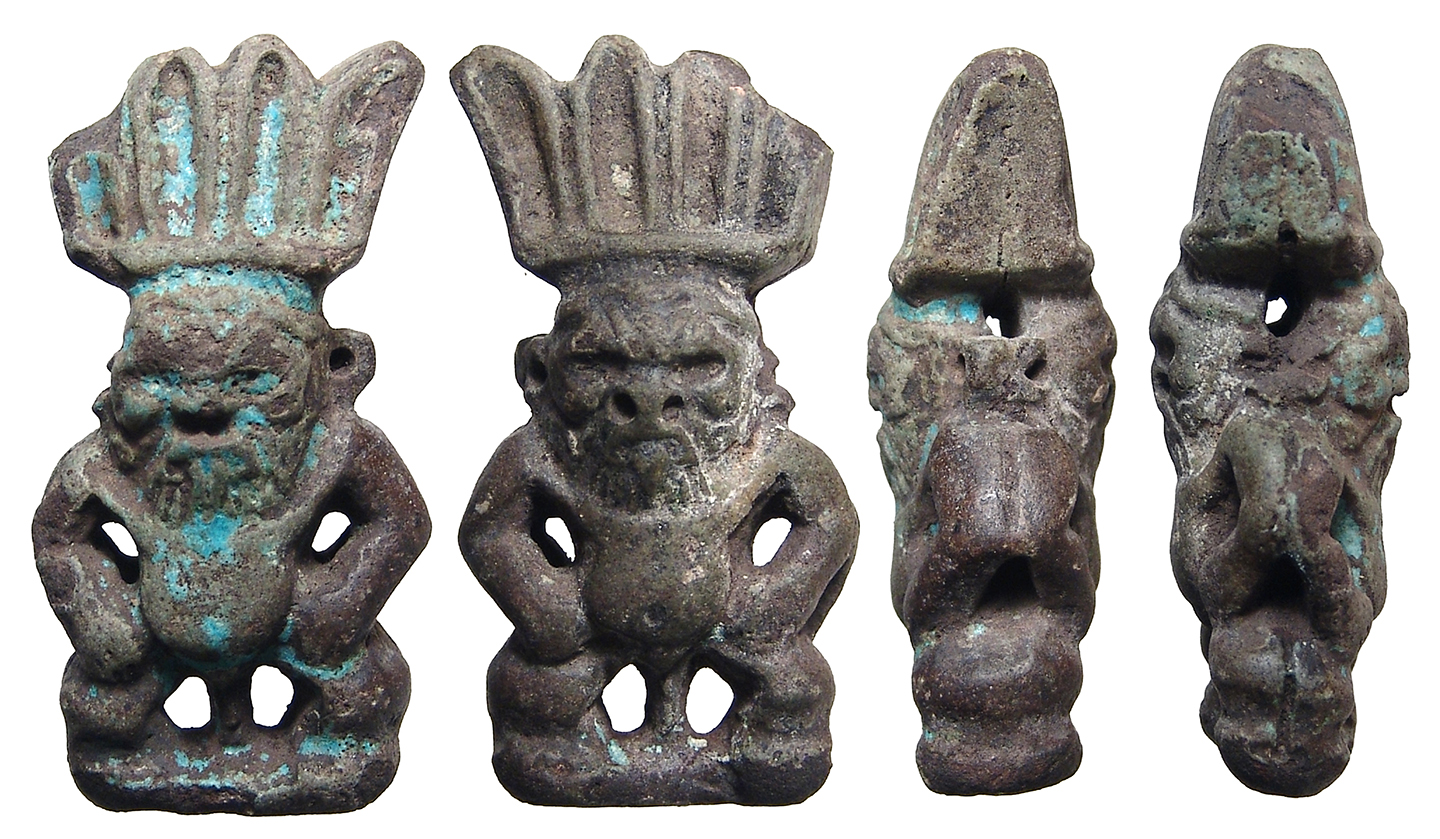 Ptolemaic Egypt, c. 332-30 BC. A small faience amulet of the god Bes. Protector of households, mothers, and childbirth. Nice blue-green color, holed-through lengthwise for suspension in ancient times. H: 12mm. Ex Los Angeles, CA collection. #PV042: $99 SOLD