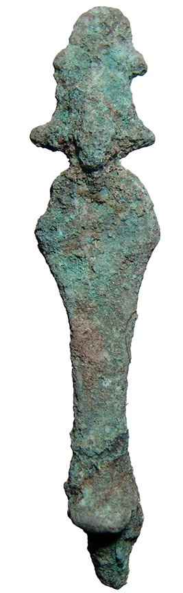 Ancient Egypt, Late Dynastic Period, c. 664 – 332 BC. Small Egyptian bronze figure of Osiris. Depicted mummiform, wearing atef crown with uraeus and false beard, arms folded across chest, clutching a crook and flail. Short tang at base for attachment to a base or placement in a niche. 66 mm (2 5/8"). Green patina with heavy earthen deposits. Ex New Jersey estate. #AE3363: $150 SOLD