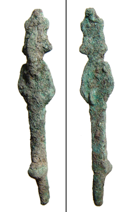 Ancient Egypt, Late Dynastic Period, c. 664 – 332 BC. A fascinating and unusual small Egyptian bronze figure of "Triad" Osiris. Three conjoined figures of Osiris, depicted mummiform, wearing atef crown with uraeus and false beard, arms folded across chest, clutching a crook and flail. Three small intact suspension loops on the back! Difficult to see in the photo. 30x18mm. Ex Vigil collection, New Mexico, purchased at Argosy Art & Artifacts 5/9/86. #PV017: $350 SOLD