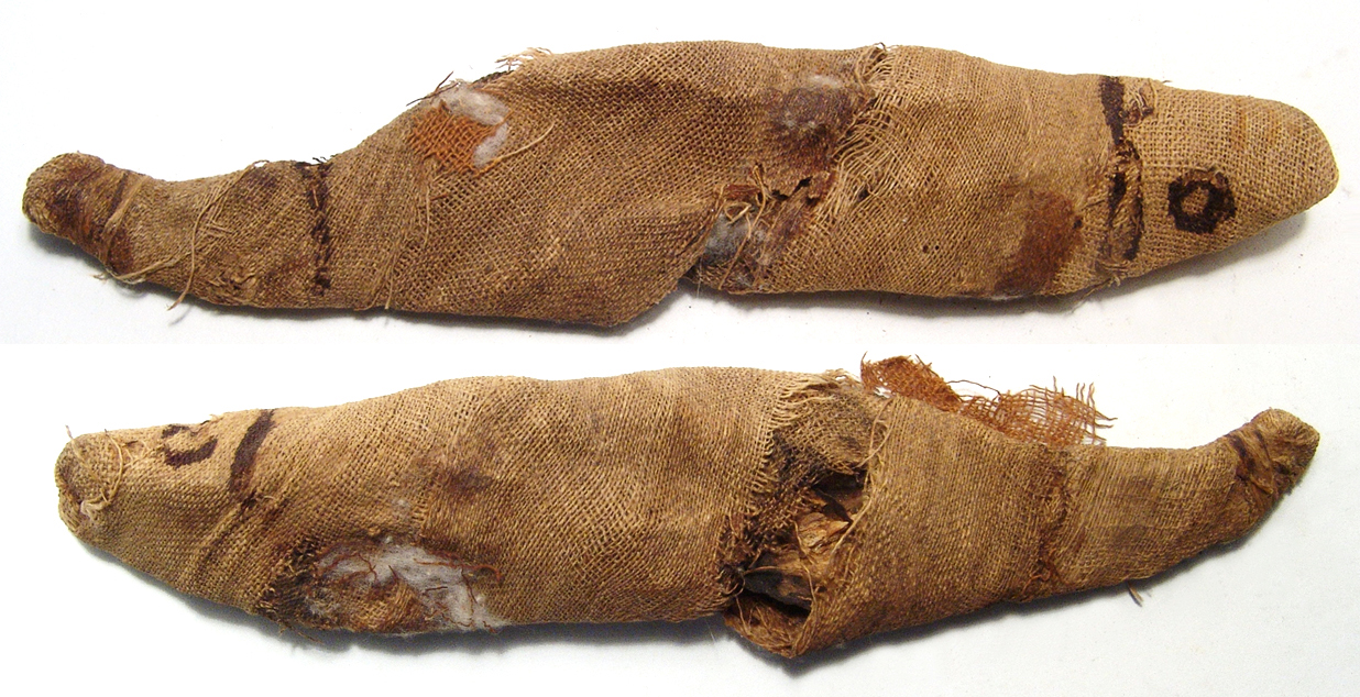 Wrapped within linen strips with details added in pigment on the head. Some loosening of the wrappings exposing the
