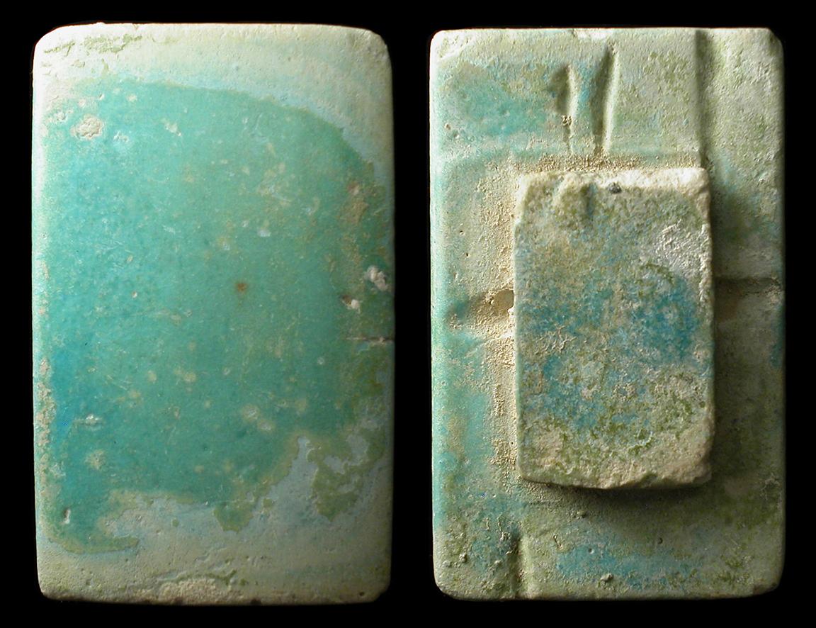 Great blue-green faience tile. With rear piercing on back for mounting in a central, raised area. They are frequently attributed to the Step Pyramid of Djoser and the surrounding complexes in Saqqara. Heiroglyphic indicator engraved on back to indicate where on the wall it should be placed. 58x36mm. Chipped in areas. Glaze a bit faded. Cf. F. Dunn Friedman, Gifts of the Nile: Ancient Egyptian Faience (London, 1998), p. 180, 17-20 for type. #TF019D: $950 SOLD