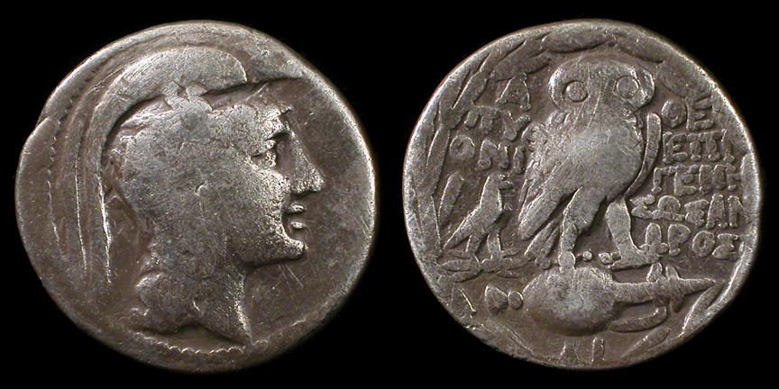 Attica, Athens. Large "New Style" Tetradrachm of c. 127-126 BC. Head of Athena right in triple crested helmet ornamented with Pegasus; forepart of horses rt. / Owl standing right on prostate amphora inscribed I, head facing; ΑΘΕ, Greek legend on either side: AIO-MA-TIMOS-GAS-NI-KWN; SA below. ref:Thompson 432 var. Big 26 mm, 16.24 g.Fantastic cabinet tone. This coin is amazing in-hand! ex-NY collection. #CG2332: $650 SOLD