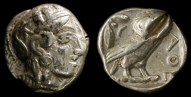 Attica. Athens, 449-404 BC. Silver "old-style" tetradrachm. Helmeted head of Athena r. with frontal eye / owl standing rt, ΑΘΕ(NS), olive sprig and crescent moon behind, all within incuse square.A nicely centered example with classic style! Nice dark cabinet tone. 16.4 g. 23 mm. Athens #1215: $625 SOLD