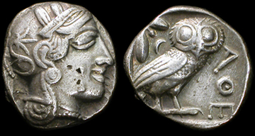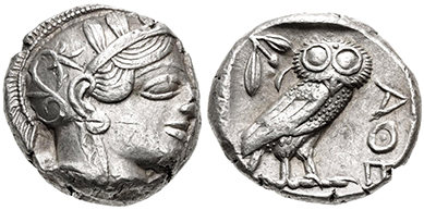 Athens, Attica, Ancient Greece, c. 454-404 BC. Silver tetradrachm. Helmeted head of Athena right, with frontal eye / Owl standing right, head facing; above and behind, olive sprig and crescent; ΑΘΕ, all within incuse square. 23.5mm, 17.19 g. ref: Kroll 8; HGC 4, 1597. Toned, small die flaw and some die wear on obverse. VF. From the John L. Cowan Collection, purchased from Pegasi, 18 September 2008; ex-CNG. #CG2567: $1250 SOLD