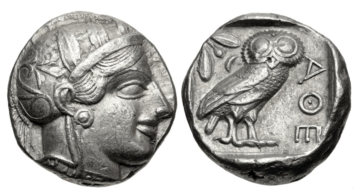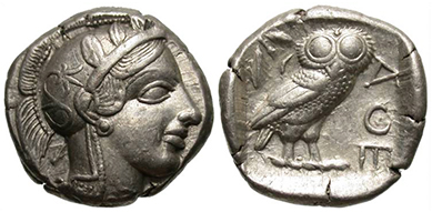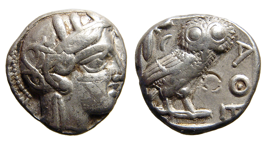 Attica. Athens, c. 454-404 BC. Silver tetradrachm. Head of Athena right, wearing crested helmet ornamented with olive leaves / Owl standing right, ΑΘΕ, olive sprig and crescent moon behind, all within incuse square. 23mm, 17.21 g. ref: Kroll 8; HGC 4, 1597. Near VF, banker’s mark on the obverse. Ex-CNG. Gorgeous! #CG2319: $1200 SOLD