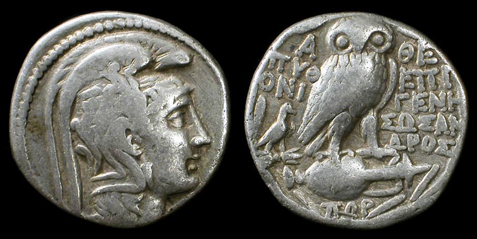 Attica, Athens. Large silver tetradrachm struck 100-99 BC. Head of Athena right in triple crested helmet ornamented with Pegasus / Owl standing right on amphora, head facing ΑΘΕ(NS); Greek legend on either side. Eagle standing upon thunder-bolt to left, monograms in fields. 29 mm, 16.16 g. Fantastic piece, with extremely nice detai! #19925: $475 SOLD