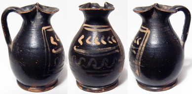 Ancient Greek South Italy. Apulia, mid-4th century BC. Lovely miniature Xenon-ware olpe. Finely painted patterns in orange/creme, delicately formed spout and rim. Single handle on back. Intact! Stands 65 mm (2 1/2") tall. #90918x2: $399 SOLD