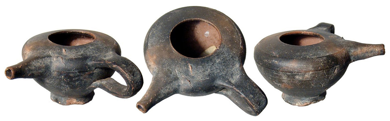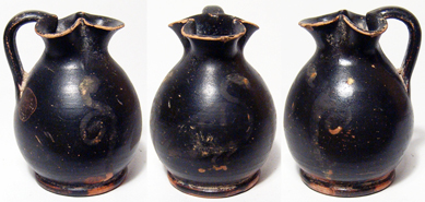 Ancient Greece, c. 4th - 3rd Century BC. Nice Greek ceramic olpe, the body tall and tapered toward the bottom with flat disk base with outer ridge. The neck is narrowed with flared mouth and a single strap handle. H: 3 1/4" (8.3 cm). Intact with remains of black glaze. Ex Chicago private collection. #AG2033: $225 SOLD