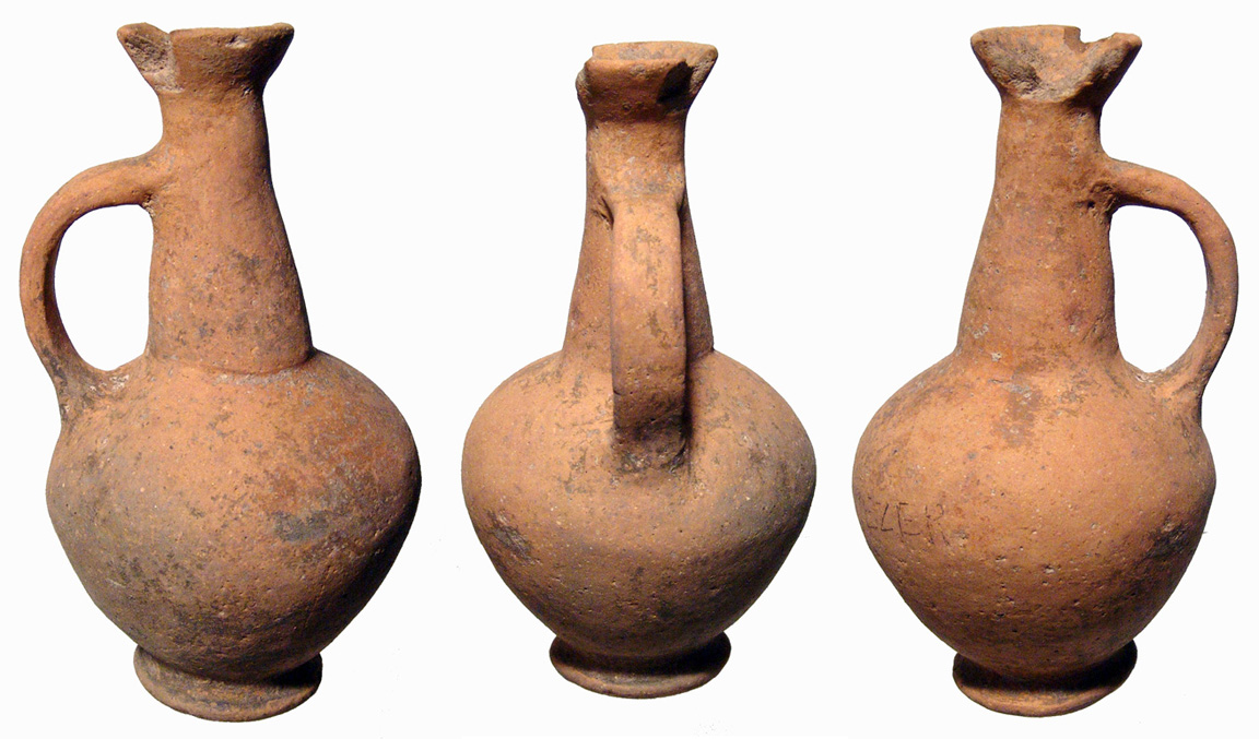 Cypriot pottery flask, c. 1400-1200 BC. Found in an excavation at Gezer in the early 20th century. Middle Bronze Age "bil-bil" with globular body, long tapered neck, single handle and round foot. Part of spout broken in antiquity. Excavation tag "GEZER" in pencil on body. 132 mm (5 1/4") tall. #271012: $275 SOLD