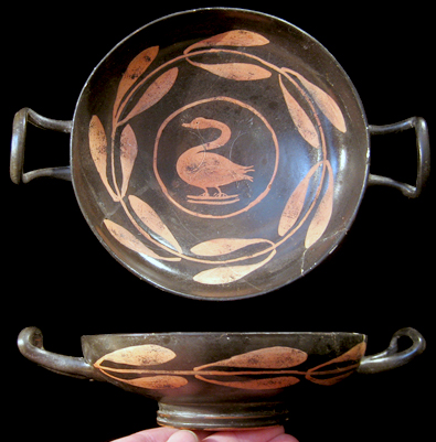 Greek South Italy. Daunian, c. 4th century BC.Ancient Greece, Campania, 4th century BC. A beautiful xenon-ware red-figure kylix depicting a standing swan, surrounded by laurel-leaf border. Some original earthen encrustation, which adds to its charm. Expertly repaired from sherds. Measures about 8 inches (202 mm) handle to handle, and stands about 1 5/8 inches high. From an old New York collection. #484: $800 SOLD