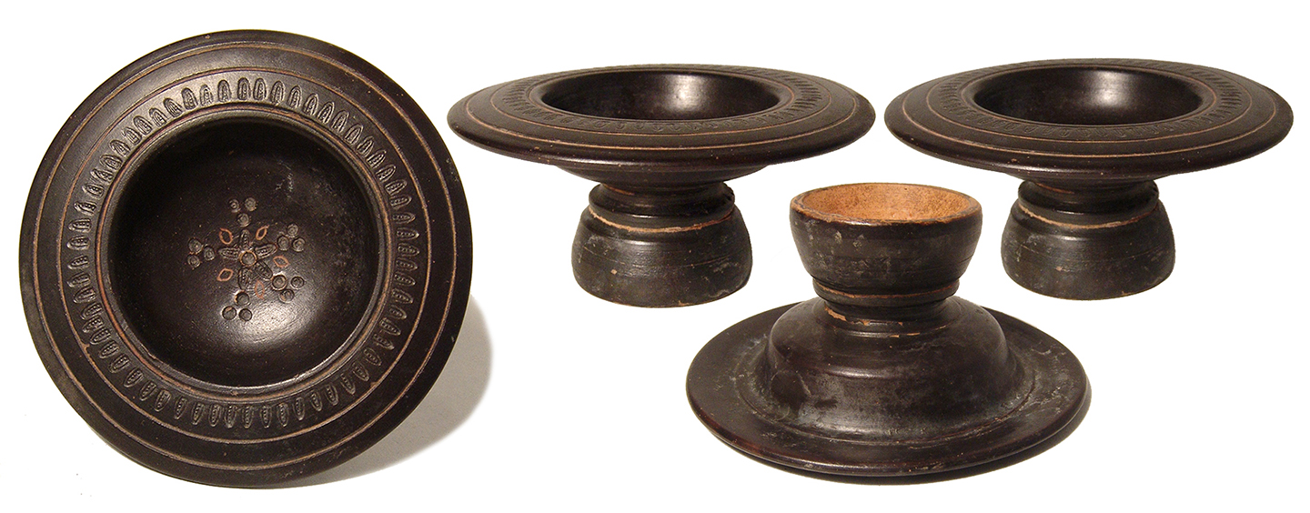 Ancient Greek. Apulia, South Italy, c. 4th century BC. Gorgeous small black-ware footed cellar dish. The rim and bowl decorated with delicate incised and impressed designs, with floral design at the center, traces of red and white paint still visible in the details. With rounded foot and short, decorative stem. W: 9.2 cm (3 5/8"); H: 4 cm (1 5/8"). Ex-Lester Gross Collection, New York City, collected in the 1970's. Beautiful! #AG2151: $650 SOLD