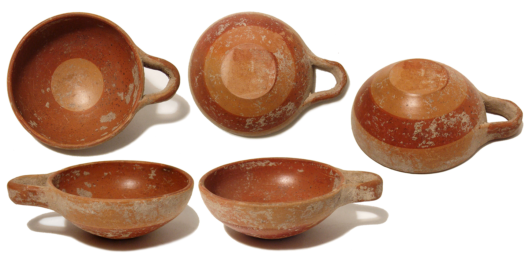 Ancient Greek, c. 4th-3rd century BC. Gorgeous terracotta drinking cup. With shallow bowl with single loop handle, decorated with bands of red-orange slip around the inside and outside. Great color with mineral deposits. L: 4 9/16"; H: 1 1/4". Ex-collection of Howard Sirak, Columbus, Ohio. #AG2163: $399 SOLD