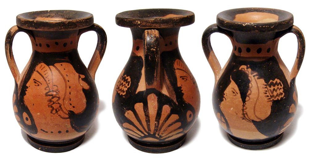 Ancient Greek South Italy. Apulia, mid-4th century BC. Lovely miniature Xenon-ware olpe. Finely painted swan on front, with floral motifs around... now mostly faded. A few traces of original fingerprints left in the slip! Stands 70 mm (2 3/4") tall. #90919: $375 SOLD