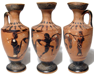 Athens, ancient Greece, c. 5th Century BC. An Attic black-figure miniature lekythos depicting a battle scene! The three figures fully armed and engaged with weapons drawn. An attractive little vessel with vertical tongues around the shoulder and solid black above the foot, on the spout and handle. H: 3 3/4" (9.6cm). Ex German private collection, acquired in the early 1980's #AG2131: $575 SOLD